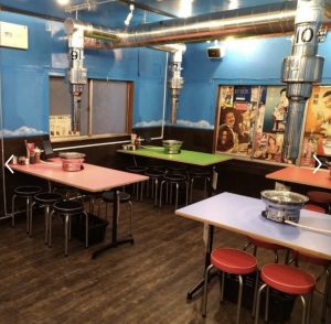 広々としたカジュアルな空間です!大人数にもぴったり!1卓ずつ色を変えたテーブルはカラフルで壁にも遊び心たっぷり。