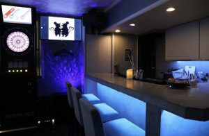 暖色の照明にブルーの間接照明でオシャレな空間。