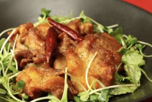 外は香ばしく、内はジューシーなチキンに、ピリッとしたソースが絡み、ついつい手が止まらなくなる一品です。