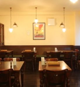 落ち着いた茶系のカラーのレトロ感ある店内。どこか懐かしいような雰囲気で、洋食がより映えますね!